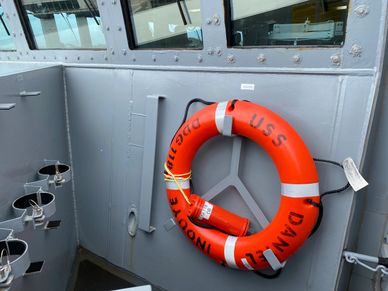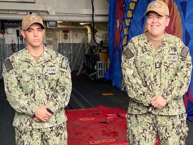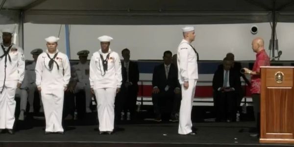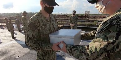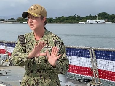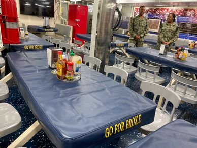 The 442's slogan "Go For Broke" is incorporated into the ship's logo and found on the crew’s caps and table coverings. Crew members who come from all over the country proudly tell you "Go For Broke" means you always give 110%. Chace Bee from Hilo, who's been in the Navy for 11 years, is grateful to be finally stationed in Hawaii. Chace told me he is inspired by Senator Inouye. "If he can do it, so can I."