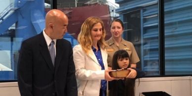 The ship’s seal used in the battle flag was designed and gifted by Senator’s daughter-in-law, Jessica Inouye (Ken’s wife) who is serving as a Co-Matron of Honor for the USS Daniel Inouye.