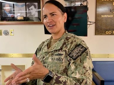 Ken spoke from his heart, informally, without notes. The audience could tell he was channeling his father's wisdom. Ken remembered his father always told him when the issue was really important, to just "Talk Story." You can build bridges by talking story. Ken told us how his father always spoke about the third line in our Constitution, and how our country is always working towards a "more perfect union." His father and others faced discrimination while serving. As we strive for a more perfect union, "what seemed right at one time, may not be just, many years later." The irony wasn't lost on the fact that "a guy who was originally considered unfit for military service because of his race, and classified as 4C was having a ship named after him." Initially, women were not allowed to even serve on war ships of the type that was before us that day. Now, this ship is commanded by a woman.